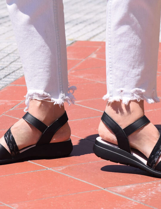 Γυναικεία σανδάλια ανατομικά μαύρα σε εξαιρετική ποιότητα για άνετο βάδισμα. Κατασκευασμένα από ελληνική εταιρεία με εξαιρετικής ποιότητας τεχνόδερμα. Διαθέτουν σκρατς σε τρία σημεία για προσαρμογή ανάλογα με το πόδι.
