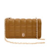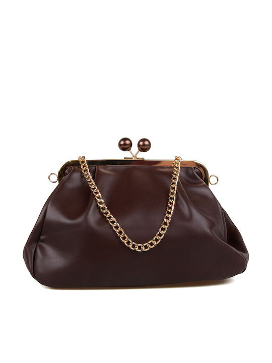Καφέ σκούρο τσαντάκι με χρυσές λεπτομέρειες. Διαθέτει αποσπώμενη αλυσίδα-λουράκι, που επιτρέπει τη χρήση του στον ώμο ή χιαστί. Εσωτερικά, περιέχει μία μεγάλη κεντρική θήκη και δύο βοηθητικές θήκες για κλειδιά ή μικροαντικείμενα. Κλείνει με έλασμα και κούμπωμα.